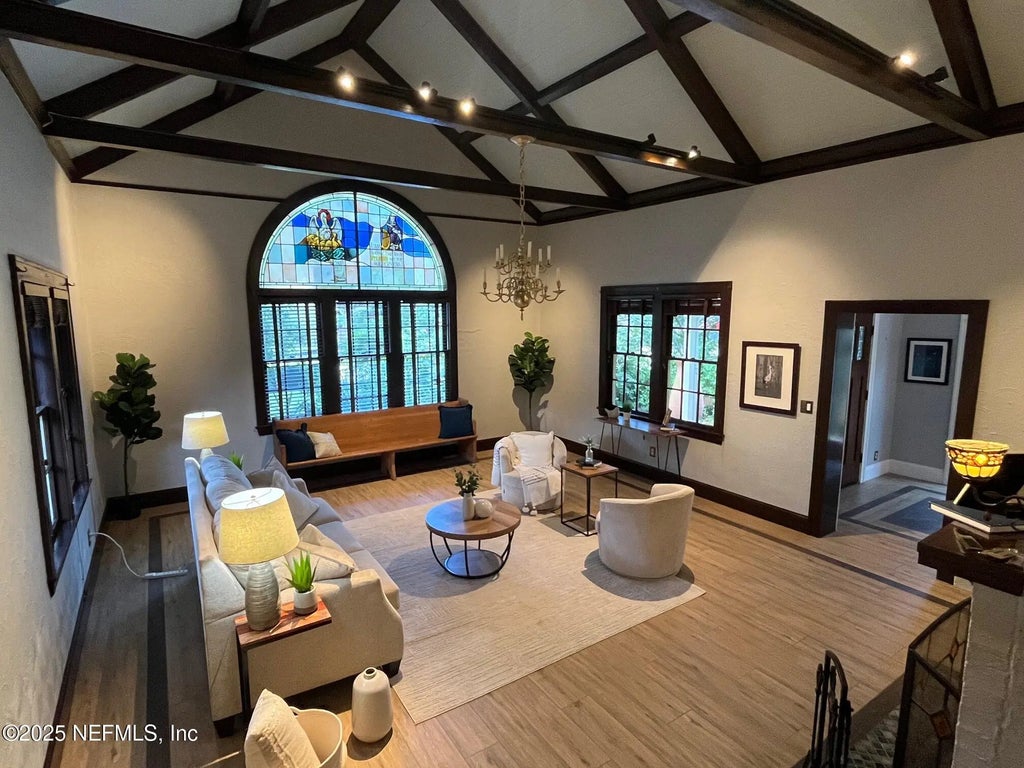 You'll never want to leave this handsome Tudor revival cottage. Effortlessly blending old world charm, luxurious architectural details and modern convenience, you'll feel worlds away, enjoying your favorite book, beverage, or simply entertaining friends in the spectacular living room, with 18 ft beamed cathedral ceilings and massive stained-glass window. The kitchen, with textured granite and SS appliances, and dining area are a fabulous place to prepare and enjoy meals. Out back, the huge covered lanai allows Florida living 365. Sit and enjoy the calming sounds of the delightful koi pond. Use the guest house for overnight visitors or as a fantastic home studio for your hobbies or business! Retire to the spacious Owners suite featuring vaulted ceilings, a western exposure and two walk in closets. Roof is new (2024)! Steps to San Marco Square, Academie de Montessori, Landon Middle School and a short drive to Hendricks Ave Elementary. Main house is 2094 sq feet, 3 /2. Guest house is 290 sq feet 1/1. Total