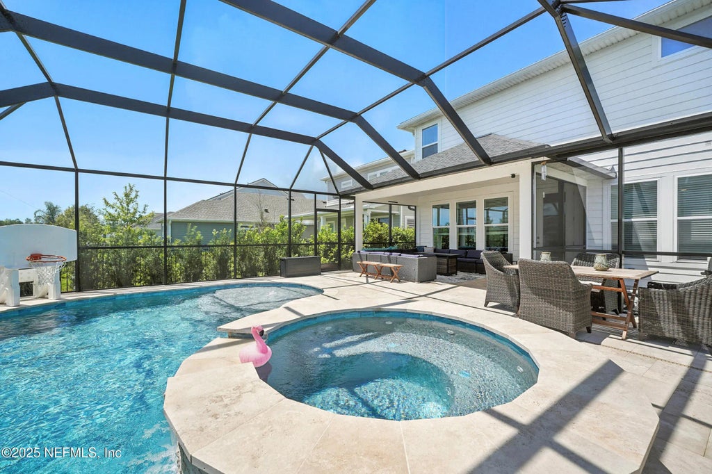 Get ready to be wowed by all the designer upgrades in this move-in ready pool home in Nocatee's Settler's Landing! 3 bedrooms, 2.5 baths, with office and large upstairs bonus/flex area. Stunning kitchen with gas stove, quartz countertops, high end stainless steel appliances, and tile backsplash. Downstairs living area/kitchen has moisture resistance LVP and the home has updated lighting throughout. Professionally maintained heated pool and spa with travertine deck and large screen enclosure was added in late 2023. Primary bedroom has spa like bathroom with double vanity and spacious walk in shower. Home boasts storage galore including oversized garage, walk-in pantry, and under the stairs. Located close to the Settlers Landing pool and park with walk/golf cart path to Palm Island Academy. Enjoy all the amentias Nocatee has to offer including Splash & Spray Parks, fitness center, pickleball, basketball, community events, shopping, restaurants, and more!