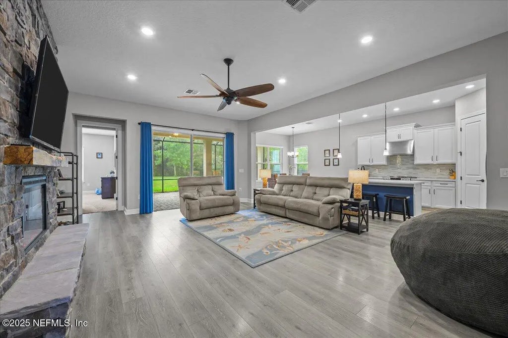 Welcome to your dream family home! Built in 2020 by Taylor Morrison, this thoughtfully upgraded residence offers 4 bedrooms, 3 bathrooms, and DUAL primary suites—one on each level—perfect for multigenerational living or private guest space. Enjoy soaring 10-foot ceilings, elegant 8-foot doors, and custom touches throughout. The chef's kitchen is a showstopper with quartzite counters, luxury induction cooktop, stainless steel appliances, a coffee bar, vented range hood, soft-close cabinetry, and pull-out drawers. The open-concept layout includes a cozy electric fireplace with live-edge mantle and real stone surround, and a custom board-and-batten entry nook. Step outside to your extended, paver-lined lanai with dual ceiling fans, and take in the lush preserve views on your oversized 0.3-acre lot—no rear neighbors! A fully fenced backyard with access to wooded trails offer space for kids and pets to explore. The downstairs primary suite boasts... a wall of bay windows, dual vanities, large step-down shower, and dual closets. Upstairs, a second primary suite includes its own AC unit, en-suite bath, and forest viewsideal for guests, teens, or even a bonus game room. Additional features include a custom laundry room with live-edge folding table, an extended two-car garage with Jeep lift hoist, and ample storage throughout. Zoned for Nassau County's A-rated schools, this family-friendly, golf-cart-approved neighborhood includes a resort-style amenity center with gym, beach-entry pool, playground, pickleball, tennis, and seasonal events. Don't miss this rare findprivacy, upgrades, space, and community all in one!
