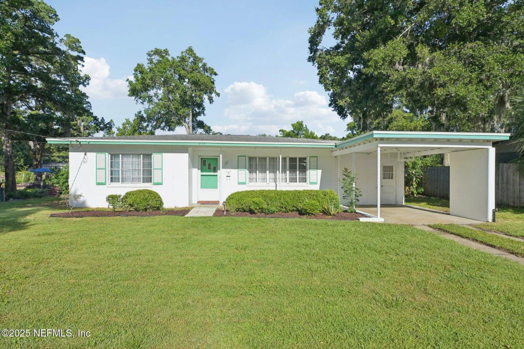 Welcome home to San Jose Lakewood! Step inside this large living room with a separate room used for dining. It holds a large sliding glass door, to view the large back yard with fruit trees and blooming tropical plants. Including a 10x10 tool room with work bench, shelving and room for a riding lawnmower. Home features new LVP flooring in the living areas and new carpet in the bedrooms. The kitchen has new appliances, new sink and countertops. The bathroom has a new cabinet, sink and a linen closet for extra storage. The pitched roof was shingled in 2013 and the partial flat roof in 2024. There is an indoor laundry room and a separate closet for more storage. Hot water heater replaced 2/2022; New central air & heat in 2020. The home is located near 3 shopping centers, LA Fitness, several parks, schools, churches, 2 Country Clubs and restaurants. Close to I-95, downtown, the beaches and St Augustine . Don't miss this one!
