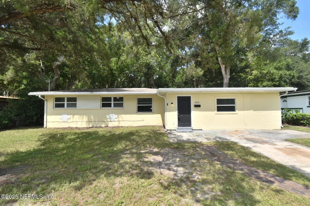 Welcome to 4332 Biddy Lane West, a beautifully updated Jacksonville home for sale in the desirable Cedar Hills Estates community. This 4-bedroom, 2-bathroom concrete block ranch offers 1,631 square feet of living space and blends modern comfort with timeless Florida charm. Step inside to find fresh paint, luxury vinyl plank flooring, and abundant natural light throughout. The spacious living and dining areas flow into the kitchen featuring wood cabinetry, tile backsplash, ample counter space, and matching appliances, perfect for everyday cooking or hosting family and friends. Features a large laundry room with washer and dryer hook-up. The private primary suite includes a comfortable layout and en-suite bath, while three additional bedrooms provide versatility for a home office or guest space. Both bathrooms are finished with durable tile for easy maintenance. Enjoy Florida living in the expansive fenced backyard shaded by mature trees, complete with a concrete patio ideal for grilling, entertaining, or relaxing outdoors. The oversized lot offers plenty of room for pets, play areas, or even a future pool. Conveniently located near NAS Jacksonville, schools, shopping centers, dining, parks, and major highways, this move-in-ready home is perfect for first-time buyers, military families, and anyone looking to live close to it all. Don't miss your chance to own a piece of Cedar Hills Estates real estate, schedule your private tour of 4332 Biddy Lane West today!