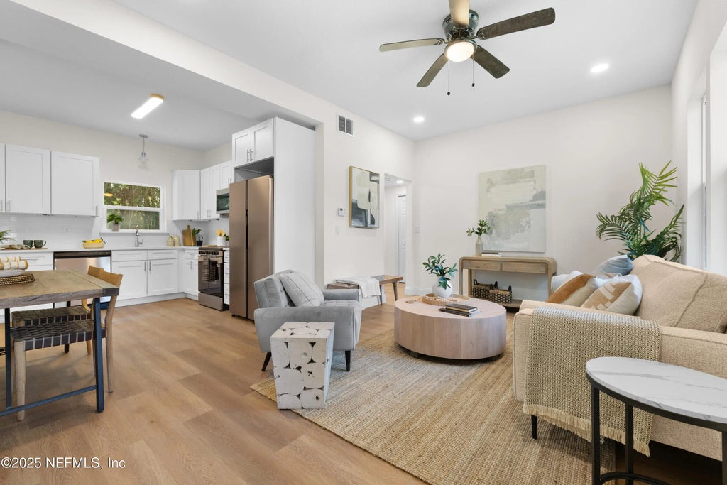 Inside, you'll find luxury vinyl plank flooring that flows seamlessly throughout, creating a warm and inviting feel. The kitchen is a true centerpiece, featuring white cabinetry paired with sleek white quartz countertops, complemented by unique designer lighting fixtures that give the space a modern yet timeless elegance.