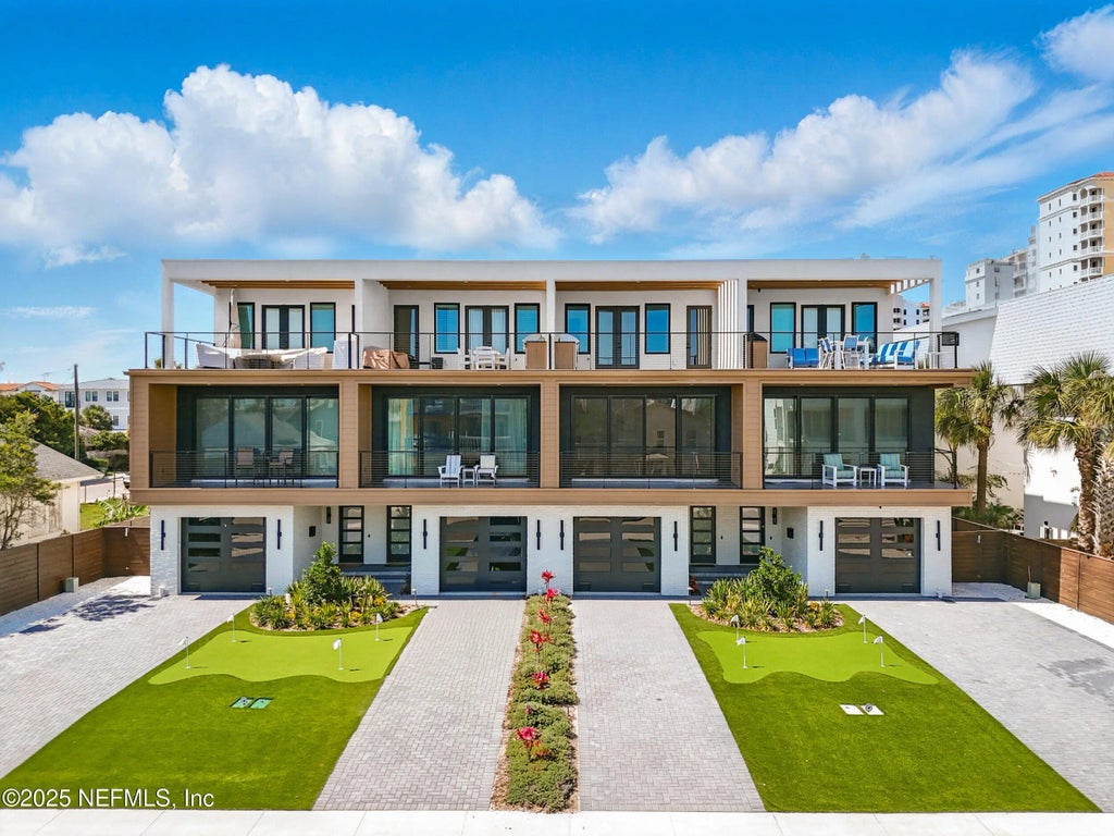 Stunning 3-story oceanview townhome, just one block from the ocean in Jacksonville Beach, featuring an elevator, top-tier appliances, and a third-floor balcony with a full outdoor kitchen. Built with solid block and concrete construction, this home blends durability with modern coastal style. This home is packed with elevated finishes that make beachside living feel like a permanent vacation. Spanning over 3,200 square feet, the layout is spacious and thoughtfully planned with 3 bedrooms, each with its own private en suite bath. Two are generous primary suites, offering flexibility if you are hosting. The first-floor bonus room can flex to suit your lifestyle, ideal as a home gym, game room, or private guest space. The kitchen is a showstopper with a natural stone waterfall peninsula, gas range, hidden walk-in pantry, and panel-ready JennAir appliances that blend seamlessly into the cabinetry. The 1.5-car garage offers room for your golf cart and all your beach gear,