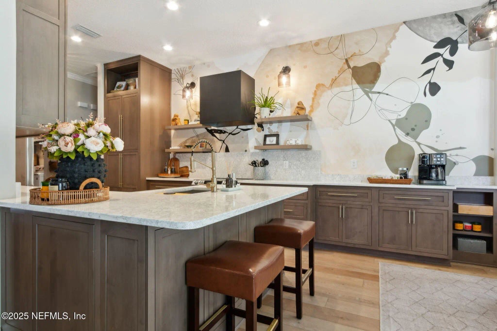 Step inside to a stunning renovation enhanced by abundant natural light. At the heart of the home is the showpiece kitchen, w/quartz countertops, induction range, custom vent hood, designer lighting & a striking custom mural imported from the U.K. The dining room features custom wine storage, while the living room is anchored by built-in corner shelving & a dramatic chandelier—offering an open flow perfect for entertaining. Thoughtful custom touches throughout add texture & dimension. Every detail has been addressed! Even the mudroom/laundry room is functional & stylish. Outside, the upgrades continue: a new roof, bamboo shades on the lanai & an extended paver patio. The irrigation system runs off its own private well. The garage is equally impressive, w/retractable screen, shelving, work sink, & multiple extra outlets. This pristine home even has room for a pool. this property is more than a home, it's a lifestyle!